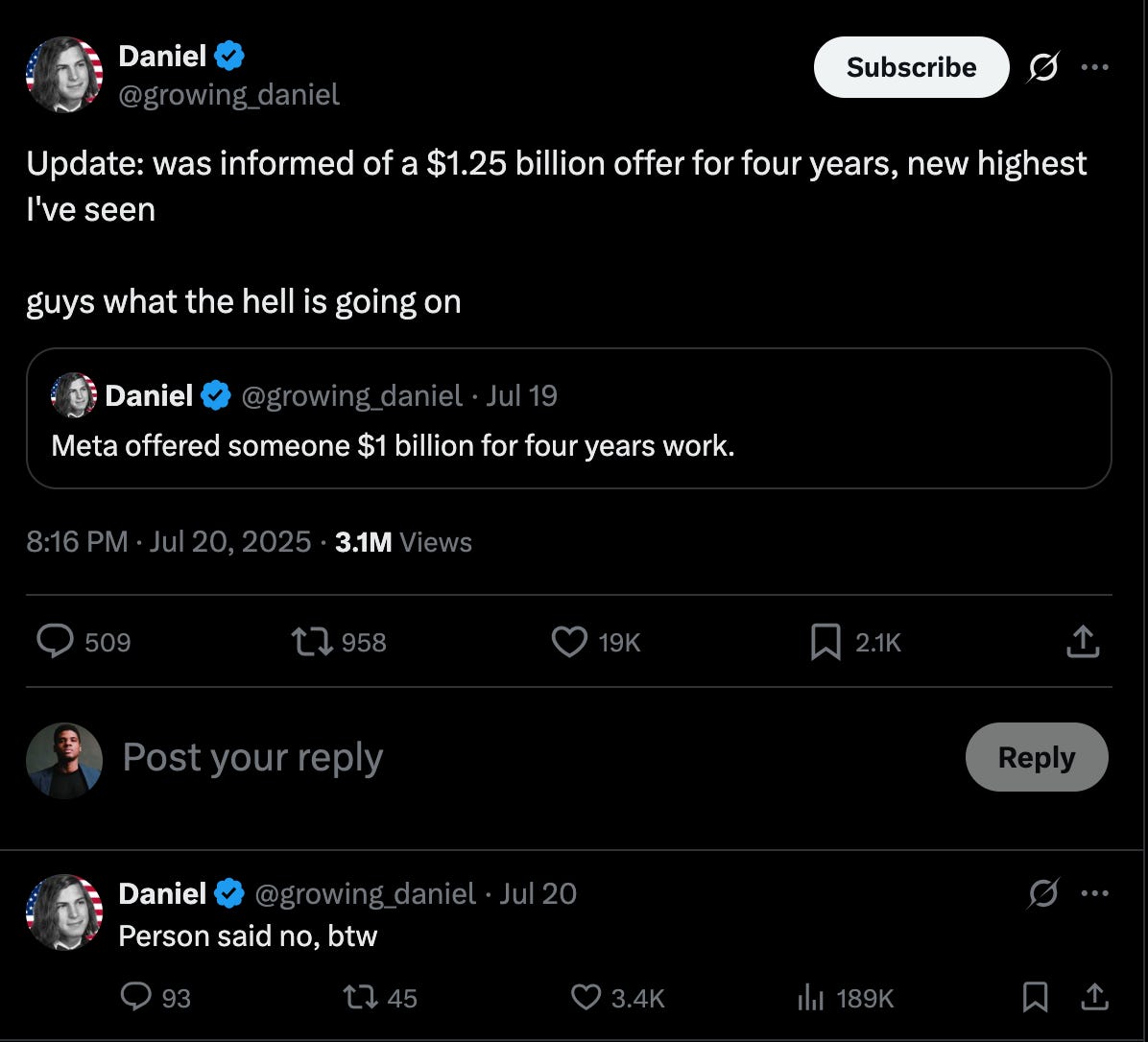 Rumors are Meta is offering up to $100m fees to hire talent. However there are rumors of figures even far exceeding that.