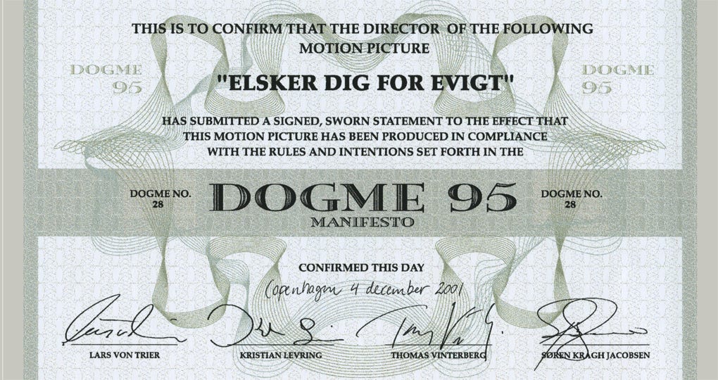 For those who missed it (or weren’t born yet): Dogme 95 was a filmmaking manifesto launched in 1995 by Danish auteurs Lars von Trier and Thomas Vinterberg.